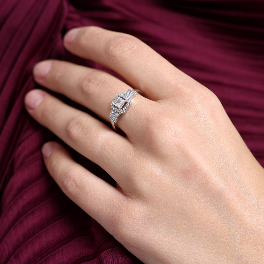 الخاتم: تصميم أنيق يبرز حجر زركون كبير محاط بأحجار أصغر تضيف لمسة فاخرة.