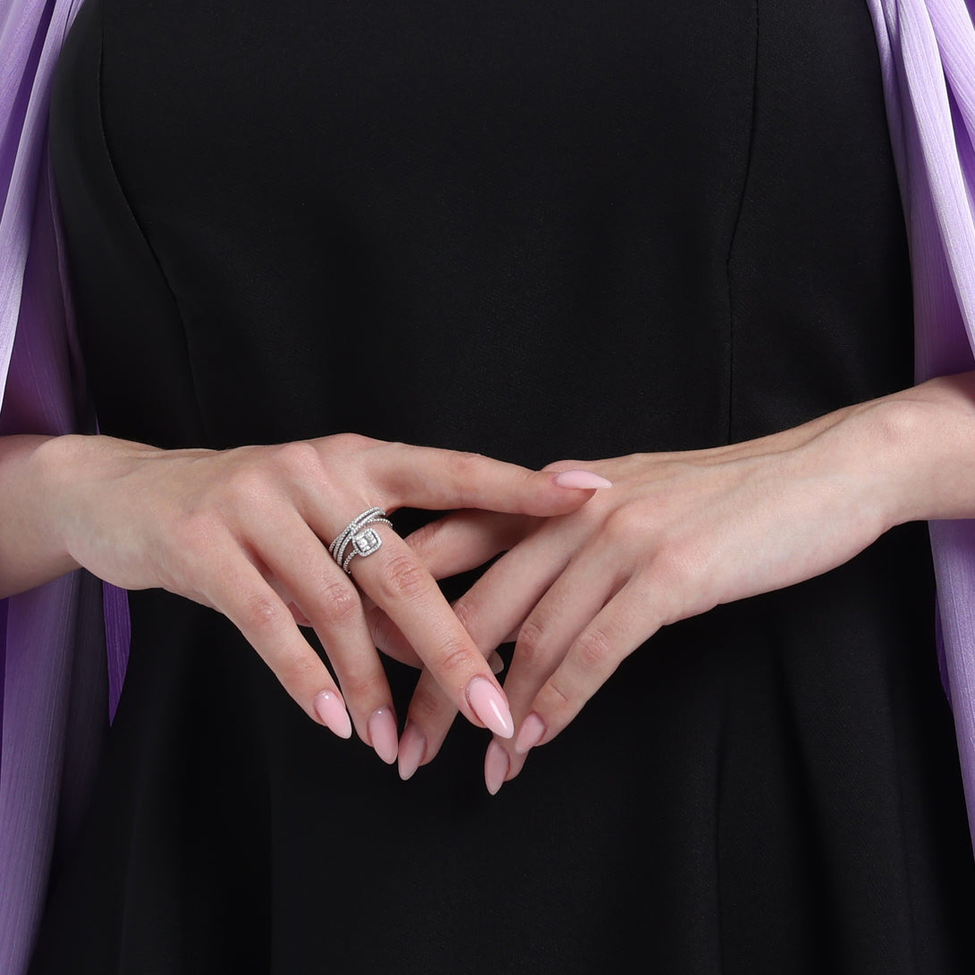تصميم عصري يتميز بالتداخل بين الخطوط المتقاطعة في طبقات مبتكرة، تتوسطه قطعة زركون مركزية مستطيلة الشكل.