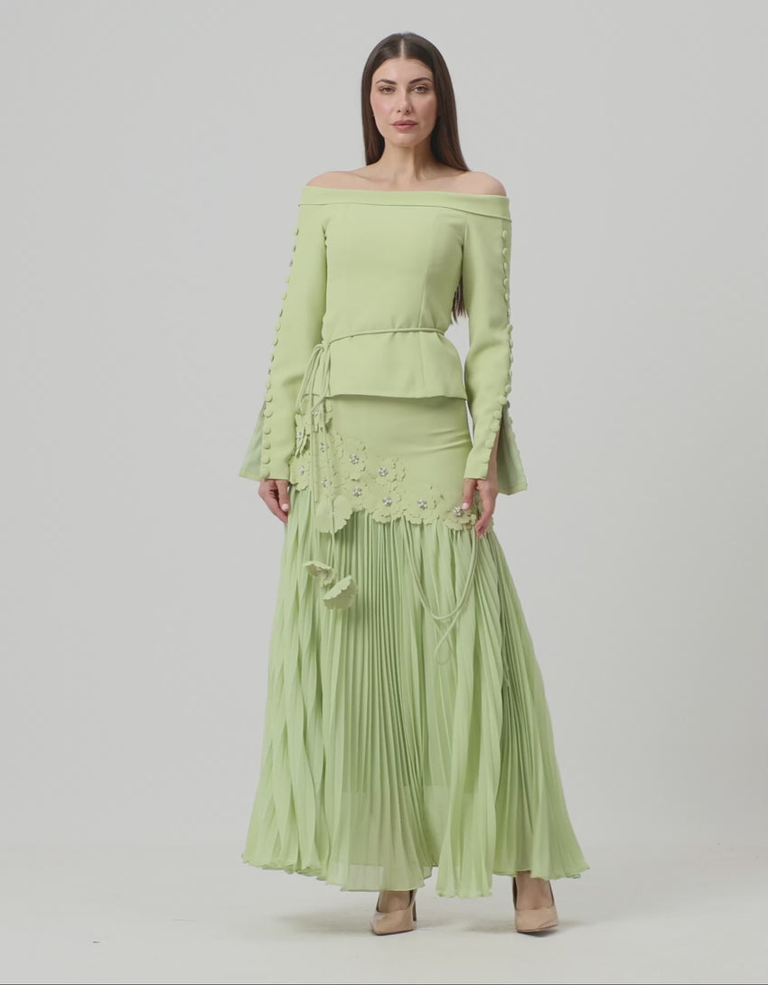يتكوّن الطقم من بلوزة وتنورة بتصميم متناسق. البلوزة بقصة أنثوية مكشوفة الأكتاف مع أكمام طويلة مزينة بأزرار قماشية تضيف لمسة فنية هادئة. التنورة ميدي بتفاصيل ورود بارزة موزعة بعناية على الجزء العلوي، مع أسفل بتصميم منسدل يعزز الحركة والانسيابية. التصميم العام يعتمد على خطوط نظيفة وتفاصيل دقيقة دون مبالغة.