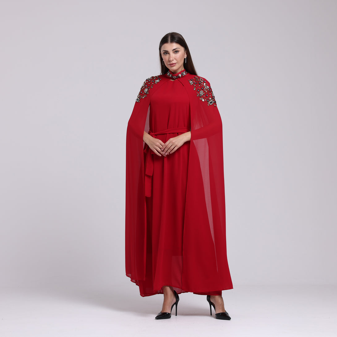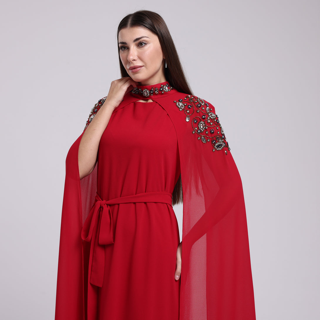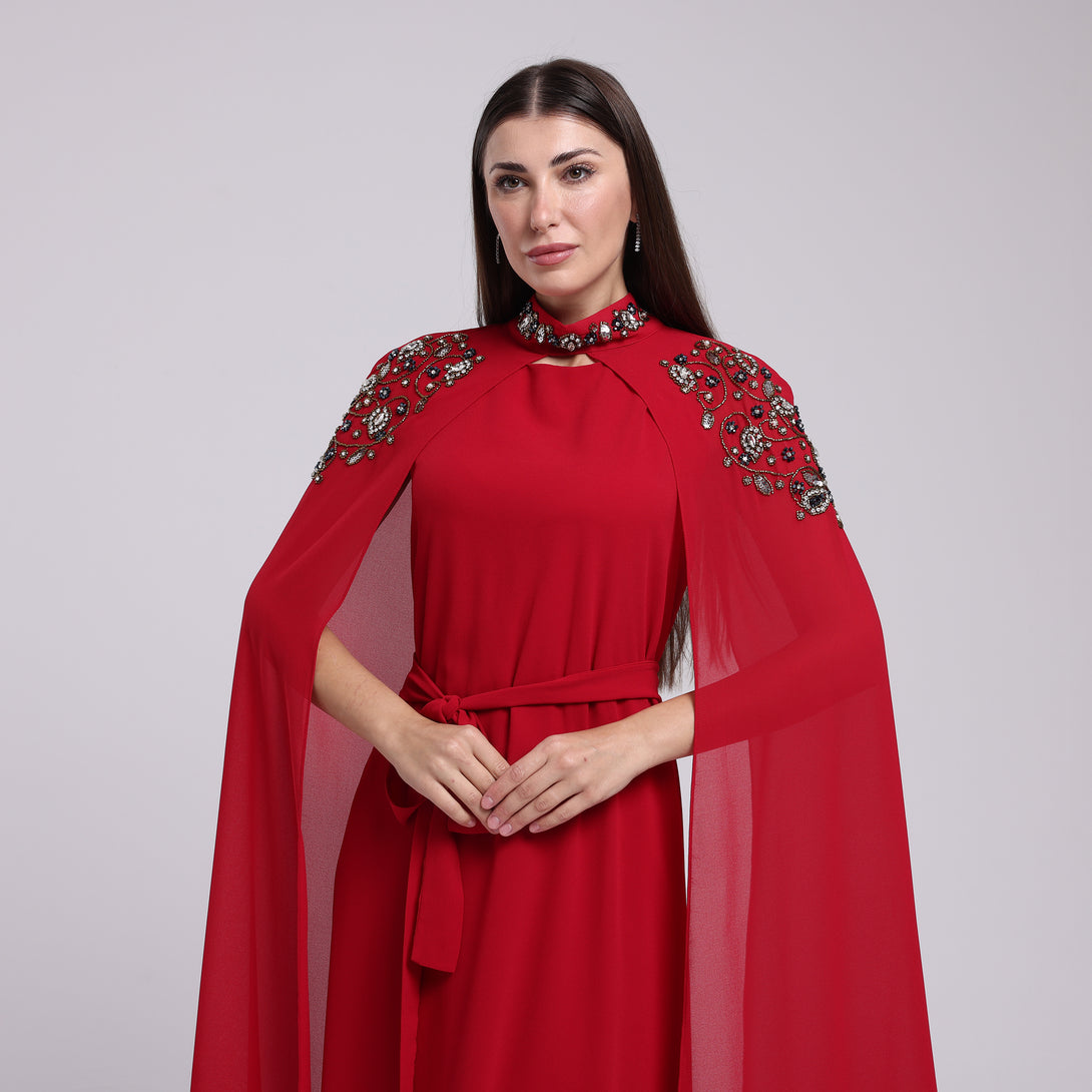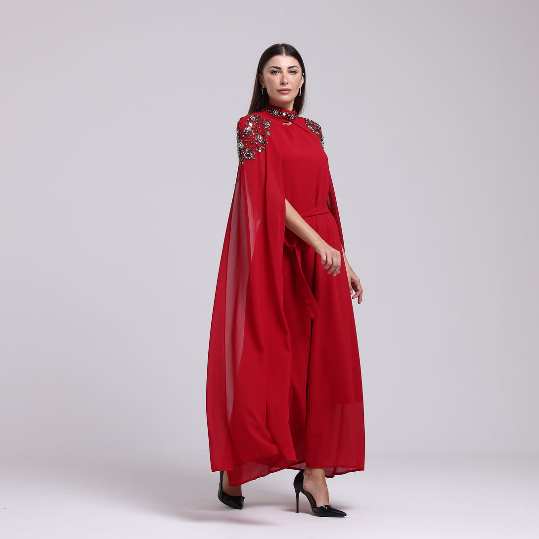 التصميم: الجزء العلوي يتميز بياقة مزخرفة بتفاصيل لامعة من الأحجار والخرز، مما يضيف لمسة فاخرة. الأكمام طويلة مزينة بتفاصيل تطريز لامع على الأكتاف، مما يبرز الأناقة. حزام خفيف على الخصر يبرز جمال الفستان ويضيف لمسة من التألق. الفستان طويل، مما يعكس الفخامة.