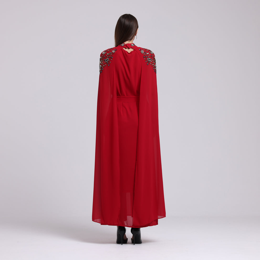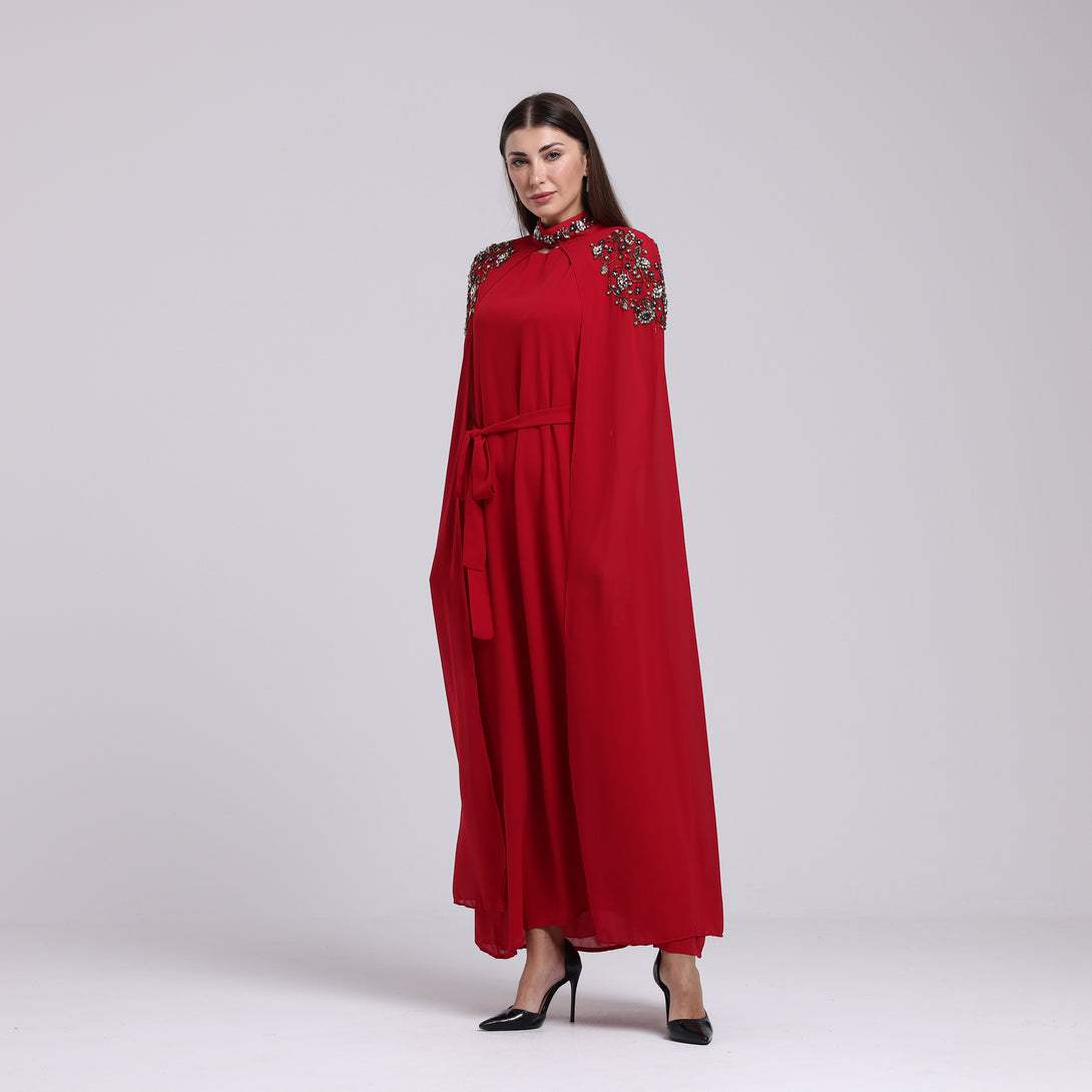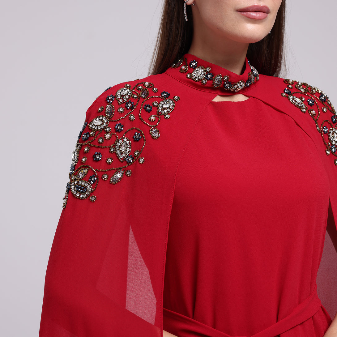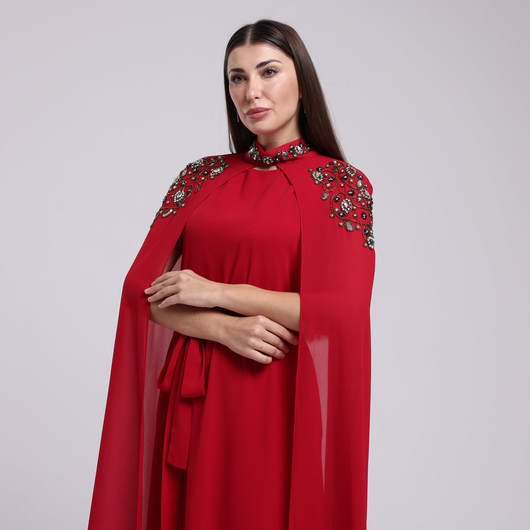 التصميم: الجزء العلوي يتميز بياقة مزخرفة بتفاصيل لامعة من الأحجار والخرز، مما يضيف لمسة فاخرة. الأكمام طويلة مزينة بتفاصيل تطريز لامع على الأكتاف، مما يبرز الأناقة. حزام خفيف على الخصر يبرز جمال الفستان ويضيف لمسة من التألق. الفستان طويل، مما يعكس الفخامة.